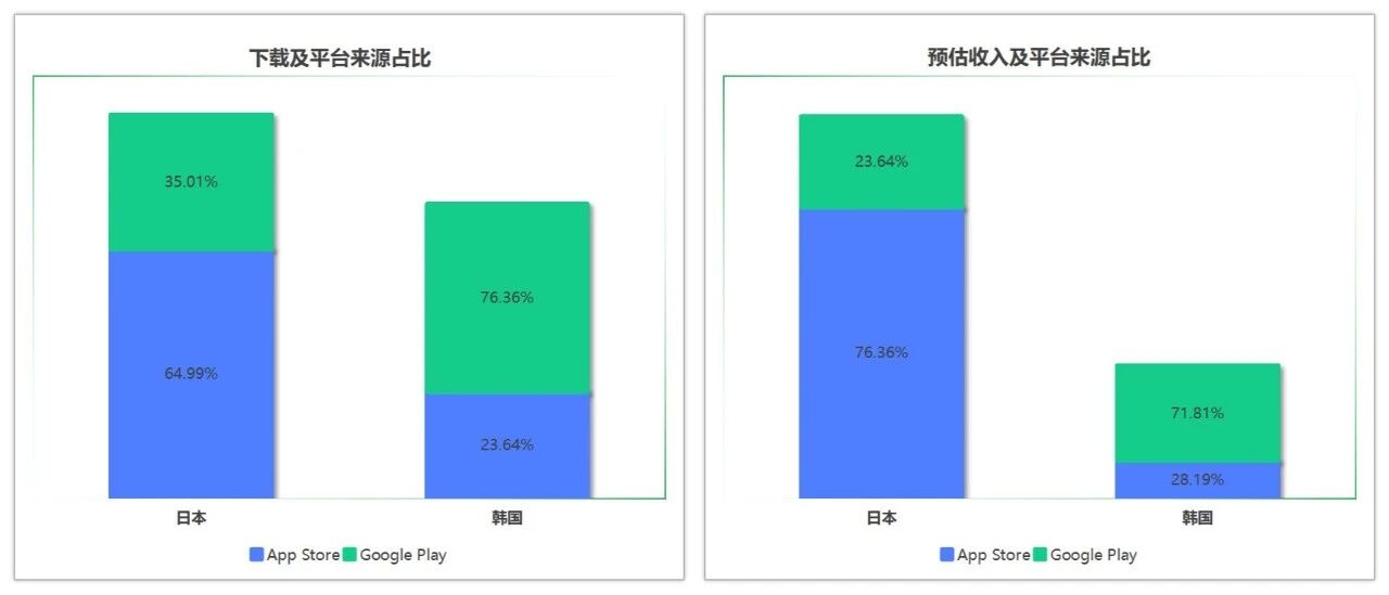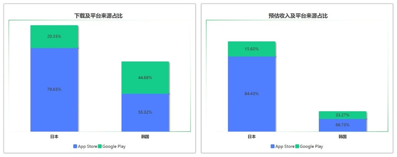 平台构成方面,下载收入两端整体都由 App Store 平台占据较大比例,其中下载端皆以日本市场贡献了相对较大的数据占比,但整体差距相比此前数月有所缩小。Google Play 方面,则依然由韩国地区在下载收入两端都贡献了较大的数据占比,且韩国地区上月该平台的移动游戏下载收入双端贡献占比都超过七成。