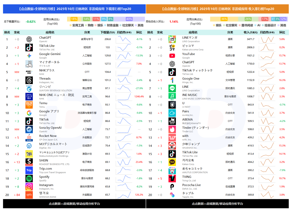 类别构成方面,下载端数据靠前的三个类别依旧为生活、工具、娱乐;收入端同样是娱乐、社交、图书参考。伴随两地官方,尤其是近几个月以来日本地区对数字科技的积极推进力度,本地区用户对于生活、工具类应用的使用频率更高。此外,AI 应用的快速发展和普及也进一步提升了此类应用的用户活跃数据。
