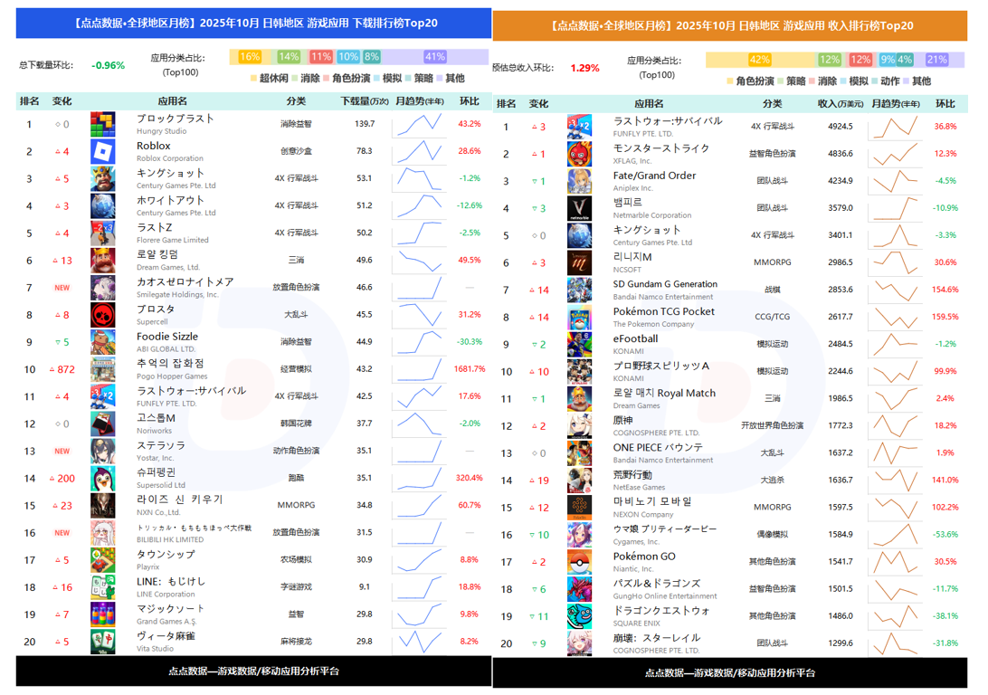 依托互联网移动应用大数据平台“点点数据”,点点出海基于日韩地区 App Store 和 Google Play 两大应用市场,统计整理下载榜和收入榜 Top20 应用&游戏,希望帮助从业者更好地了解该地区最新的产品趋势和变化。